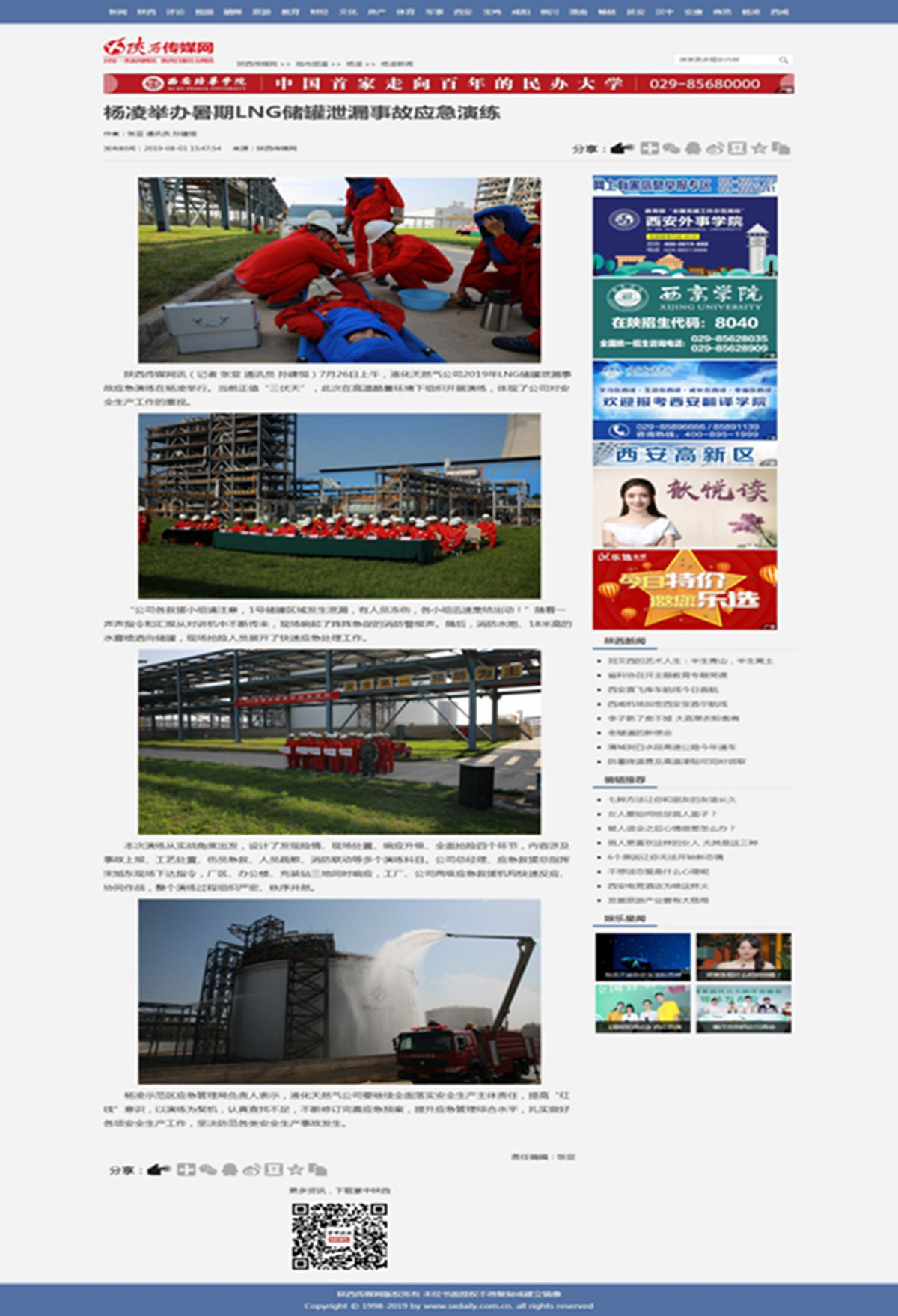 近日,三秦都市报-三秦网、陕西工人报-陕工网、陕西传媒网相继对液化天然气公司举办LNG储罐泄漏事故应急演练进行了报道。现将相关内容摘录如下: